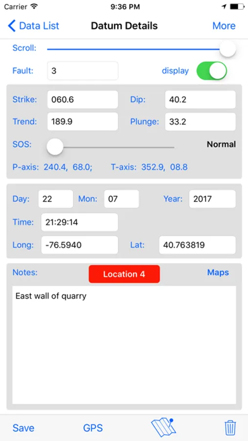 - Provide automatic data entry as a geologist's compass by reading the iOS device orientation and converting it to strike and dip of planes and/or trend and plunge of lines.