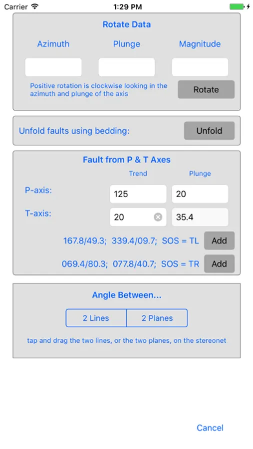 - Provide manual data entry via either tapping and dragging on the stereonet or by typing values into text fields.