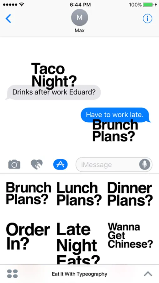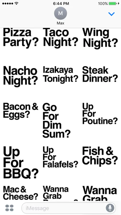 All your favorite food suggestions like “Lunch Plans?”, “Wanna Grab Burgers?” and “Korean BBQ?” now perfectly typeset in your favorite Swiss sans serif font.
