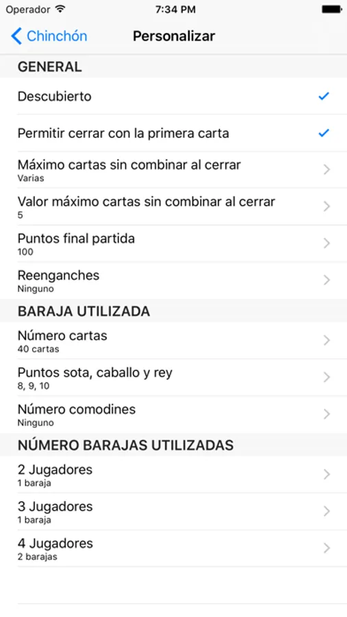- Opciones cierre: Número cartas sin combinar, puntuación máxima,...