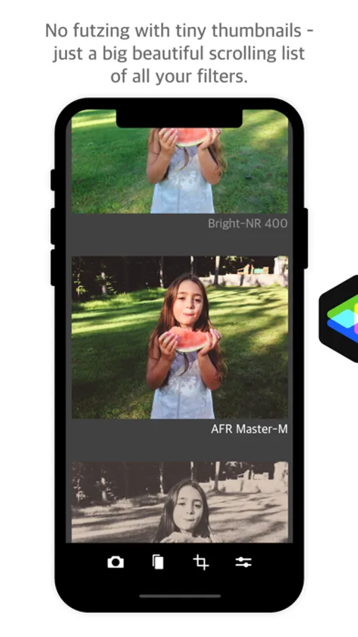 Why futz around with tiny thumbnails? We’ve made your filters into a big beautiful vertically-scrolling list of full-width images. No more saving multiple versions of your photos just to be able to easily compare them full-screen.