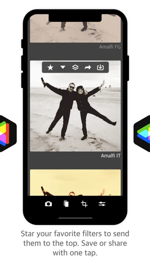 Use the star and arrow buttons to easily sort your filters, so your go-to looks will always be easily accessible right at the top. With each new photo, you can just scroll through the list and star your favorites, then go back to the top and they’ll all be right there to easily compare and choose the best one.
