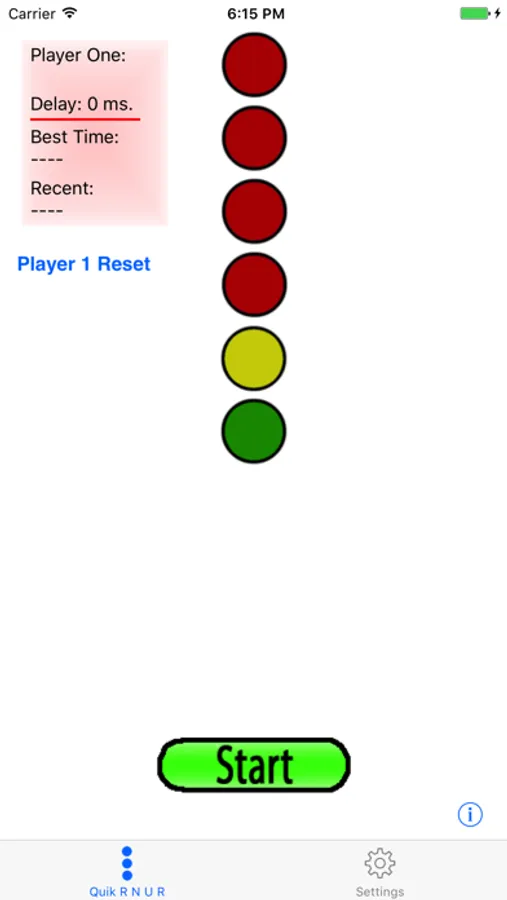 Quik R N U R is a time reaction game of skill and strategy. The goal is to press the "GO!!" button when the green light comes on. Your reaction time, which is the time from when the green light comes on to the time you press the "GO!!" button, is displayed in the top of the app.