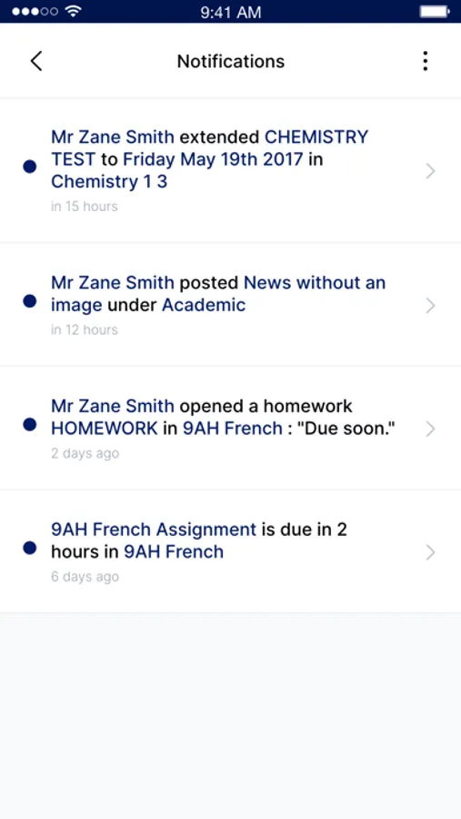 Calendar: the Calendar provides parents, teachers and students a personalised view of what's coming up for the day or in the future. Students can also receive reminders when the due date for their work is approaching