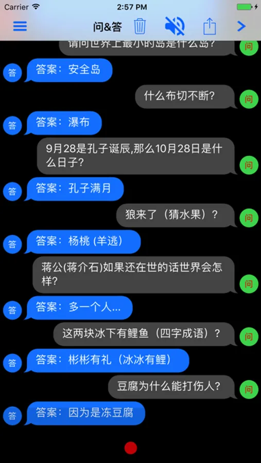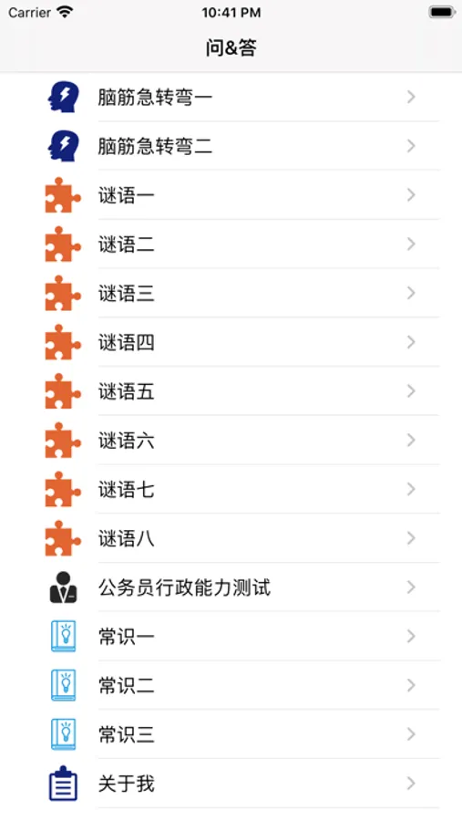 收集互联网上脑筋急转弯,谜语,公务员行测问题,常识问题等问答形式题库,以消息模式一问一答形式展示。可以用于自娱自乐,已可以测试朋友。