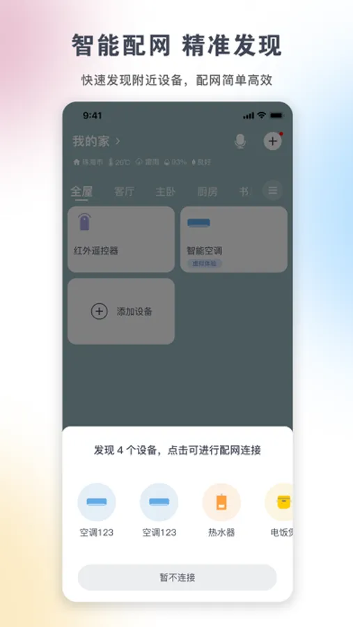 ·「设备联网」可通过扫描发现附近设备或扫机身二维码进行配网,实现远程控制。