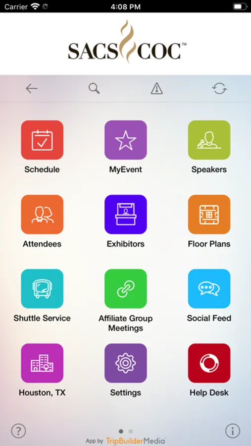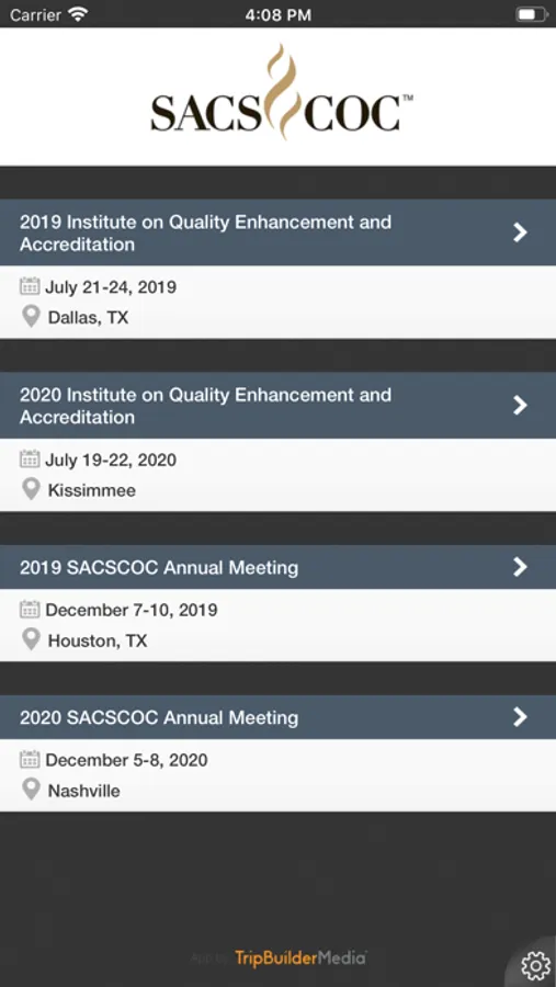 This TripBuilder Multi Event Mobile™ app is provided at no charge by the Southern Association of Colleges and Schools Commission on Colleges (SACSCOC). It was designed and developed by TripBuilder Media Inc. If you have any questions, or need any support regarding how to use this app, please submit a Support Ticket (located within the Help icon in the app).