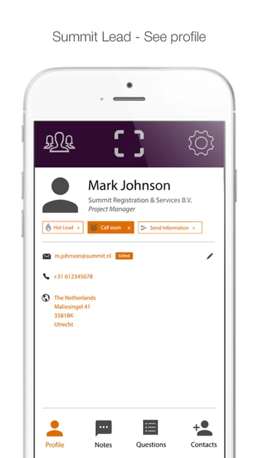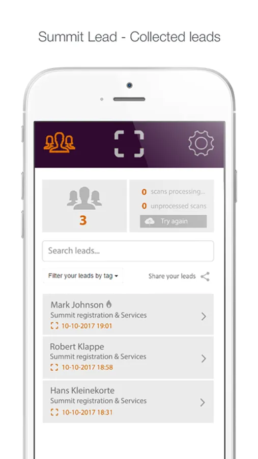 Summit Lead is the best lead retrieval app out there! Collect leads by scanning visitor barcodes. Add notes, edit contact data on the spot and add any extra qualifications immediately. Simply share your collected leads at the end of the day (or event) with yourself or your colleagues.