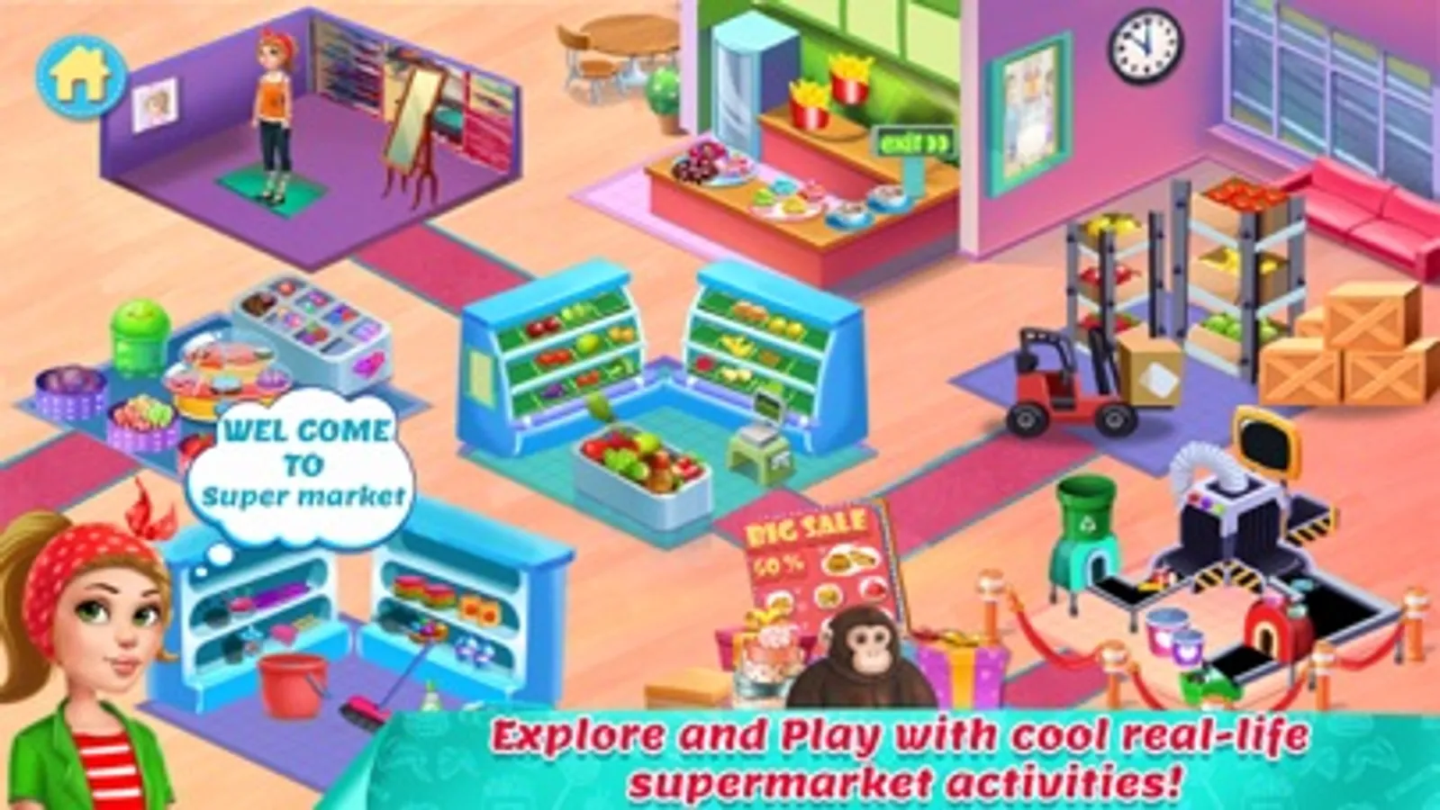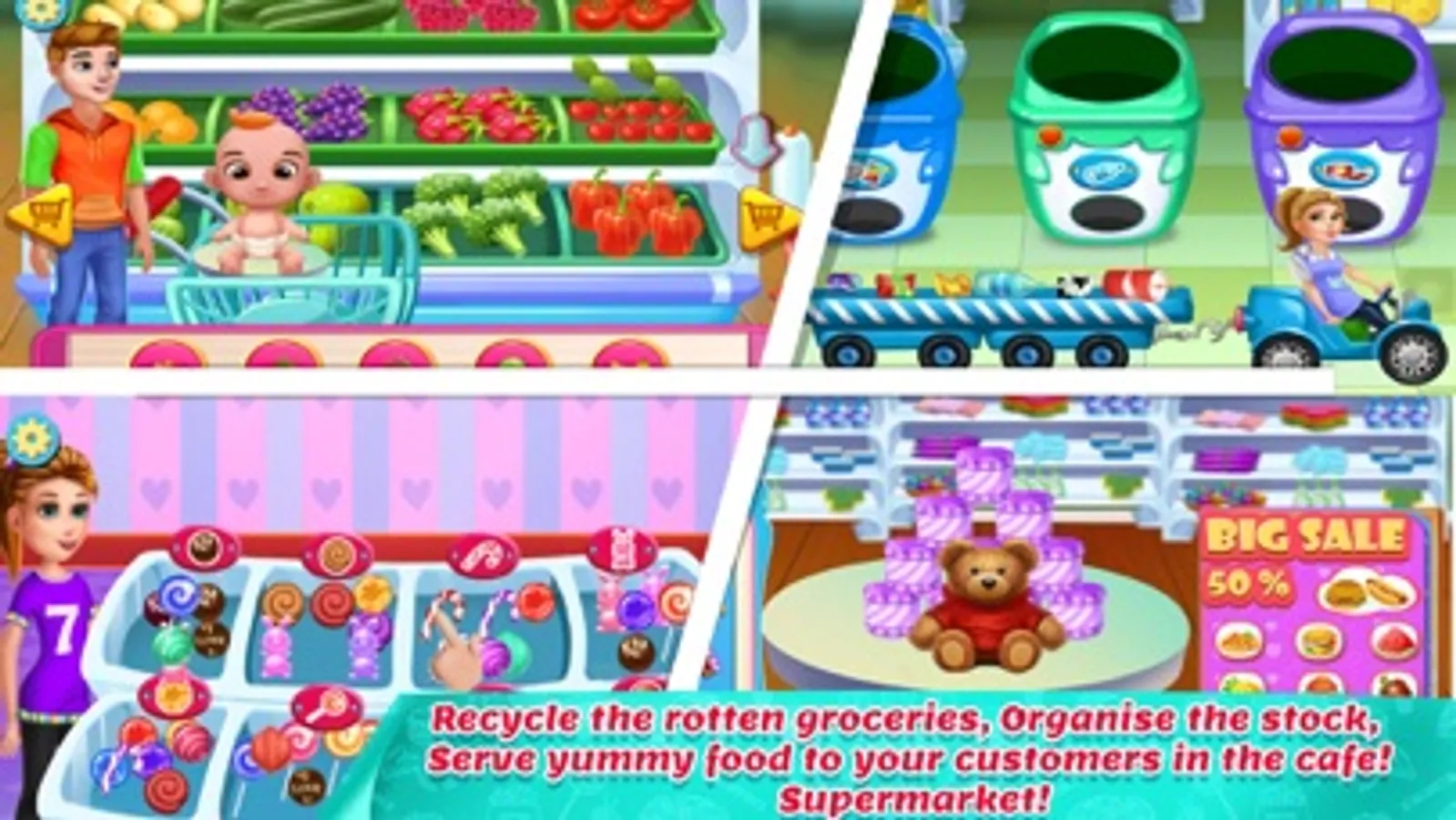 This local supermarket has a lot of sections: grocery departments, cash register, sweets and desserts area, cafeteria, toys, a recycling area and may more. Do all the necessary tasks and provide superb services to your customers.