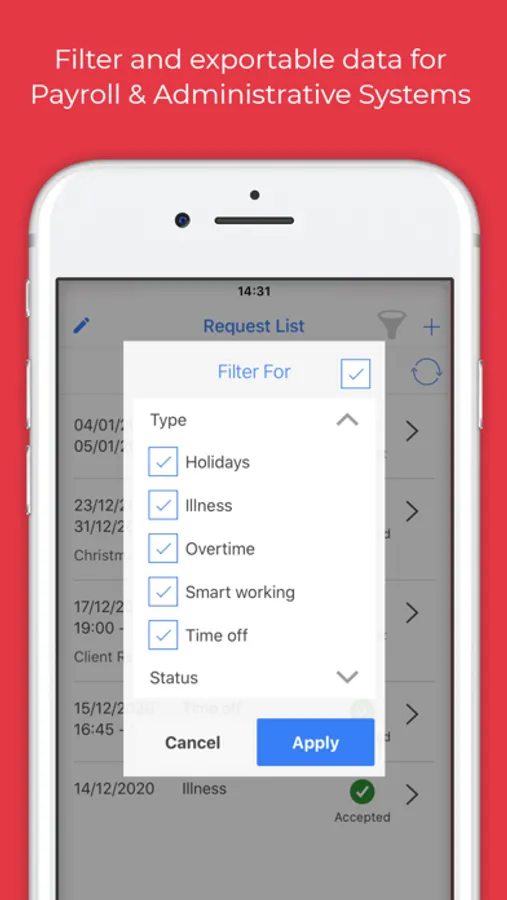- It simplifies the holidays, time-off and smart working requests insertions by using a company definable causals list for the different types of workers (employees, self-employed, consultants, etc);