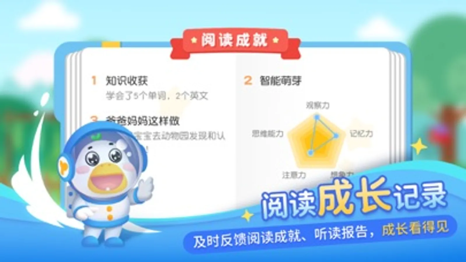 4、宝宝阅读成长记录:及时反馈每本书阅读成就:知识点、亲子阅读建议等。每月生成宝宝听读数据报告,成长看得见。