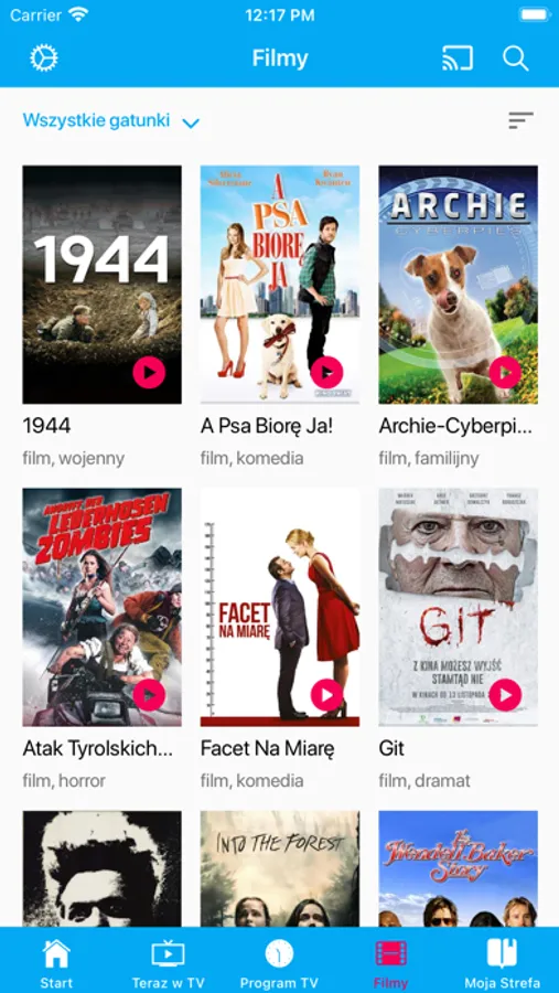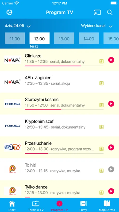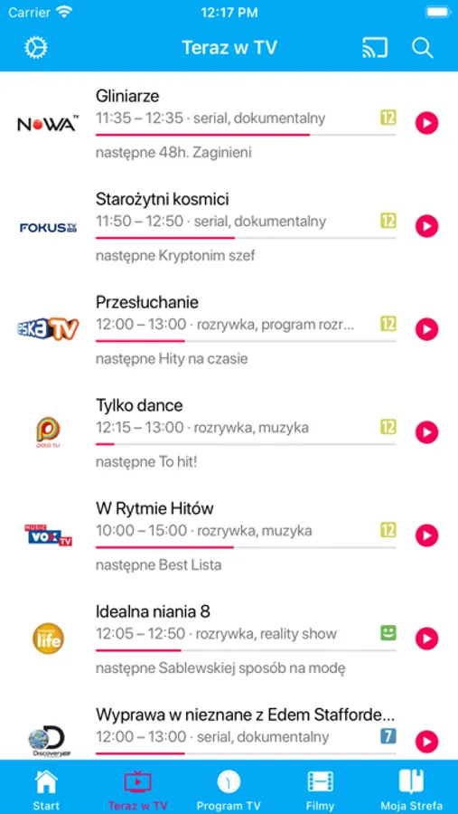 - Program telewizyjny wraz ze szczegółowymi opisami poszczególnych pozycji programowych dla wszystkich kanałów dostępnych dla użytkownika (zakładka Teraz w TV w Menu Głównym aplikacji)