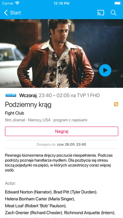 - Opcja nagrywania programu - możesz włączyć podczas jego oglądania lub zaplanować ją z wyprzedzeniem. Nagranie obejrzysz kiedy chcesz w przeciągu 30 dni.