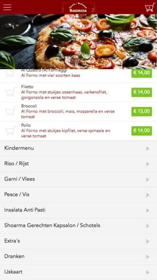De Pizzeria Sardegna app is gemaakt om gemakkelijker en sneller een bestelling te kunnen plaatsen door middel van een simpele menukaart. In de menukaart kunt u onder andere kiezen voor populaire gerechten, maar u kunt zelf ook een menu opstellen.