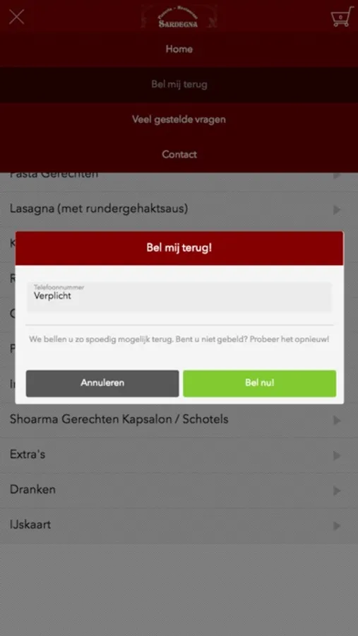 Heeft u een vraag en/of opmerking over een bepaald gerecht en wilt u teruggebeld worden door ons? Dit kunt u doen door op de ‘’Bel mij terug’’ knop te drukken en u wordt kosteloos door ons teruggebeld!