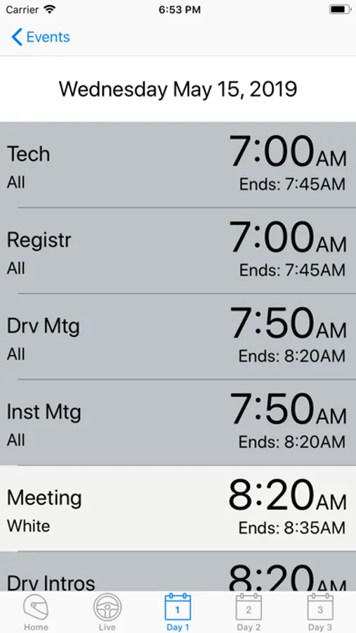 TrackKeeper also displays the full day’s schedule by Run Groups. This schedule automatically updates itself as the on track activities progress throughout the day displaying only time relevant information.