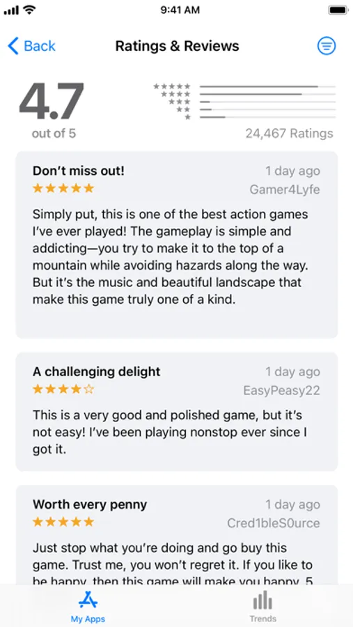 Use App Store Connect for iPhone and iPad to manage apps you've developed for the App Store. View app statuses, manage TestFlight beta testing, manage App Store submissions, and monitor app performance and sales — all from your device. You can even receive notifications about key events, like when a user posts a review, so you can quickly respond.