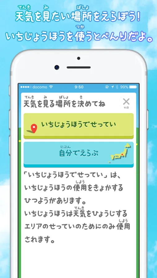 また、選択された地域や天気、気温に合わせて一言コメントも表示されます。