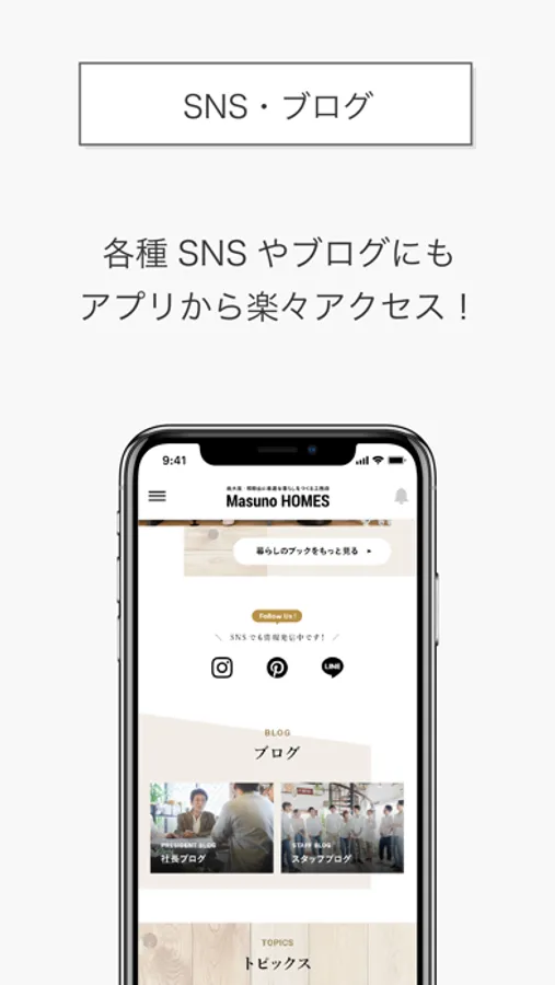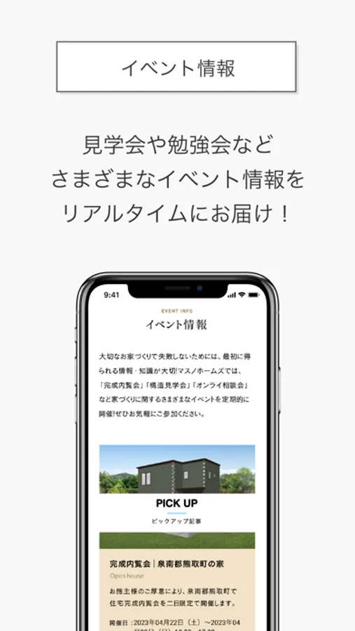 このアプリは、これから家づくりをはじめるお客様、マスノホームズで家づくりをしていただいたお客様に、新着情報やお役立ち情報をお届けできるようにと開発しました。