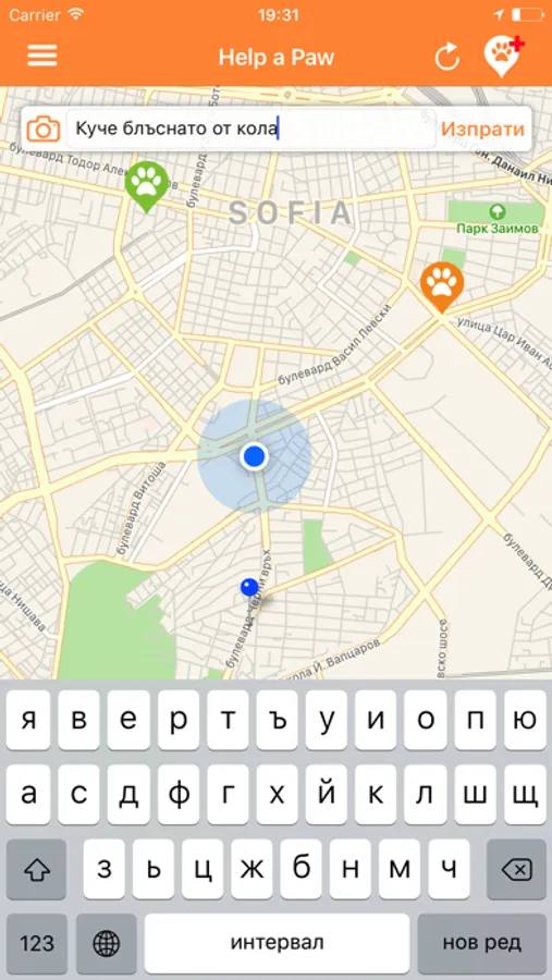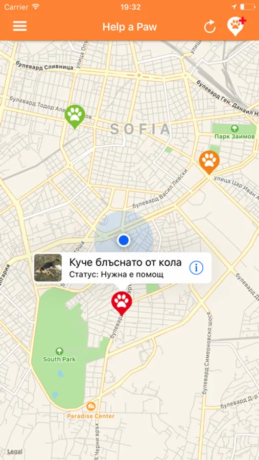 "Help a Paw" е мобилно приложение, което Ви позволява да изпращате сигнали за пострадали бездомни животни. След това доброволци (като вас!), които се намират наблизо ще получат известие. Целта е да се предостави по-надежден и бърз начин да се информират хората за спешни случаи около тях.