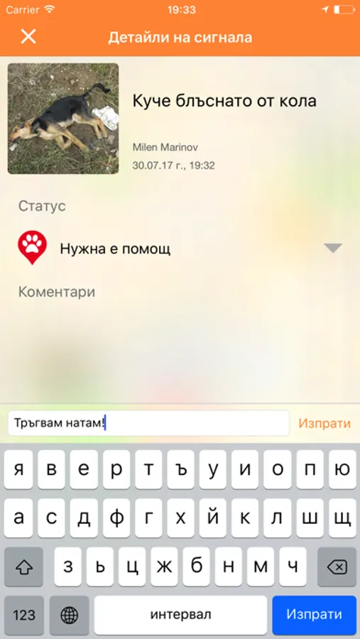 "Help a Paw" is a mobile app that lets you submit signals for stray animals that need help. After that volunteers (like you!) that are nearby will receive a notification. The goal is to provide a more reliable and faster way of informing people about urgencies around them.