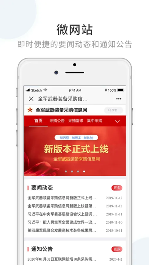 - 内嵌采购网微网站,方便用户查阅要闻动态、通知公告、采购公告、采购需求、预研指南、通用装备、法规标准、装备市场准入、服务指南等栏目板块。