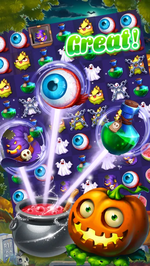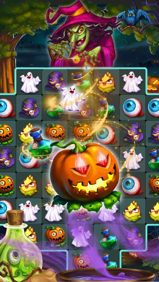 Play strategically with lesser moves and time to collect a number of magical pumpkins and unlock the mystic powers like gas pot, magic skull, power broom, and monster hand to complete the challenging levels. Spin Wheel and lucky to get the powers and candies to use in the game play.