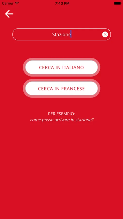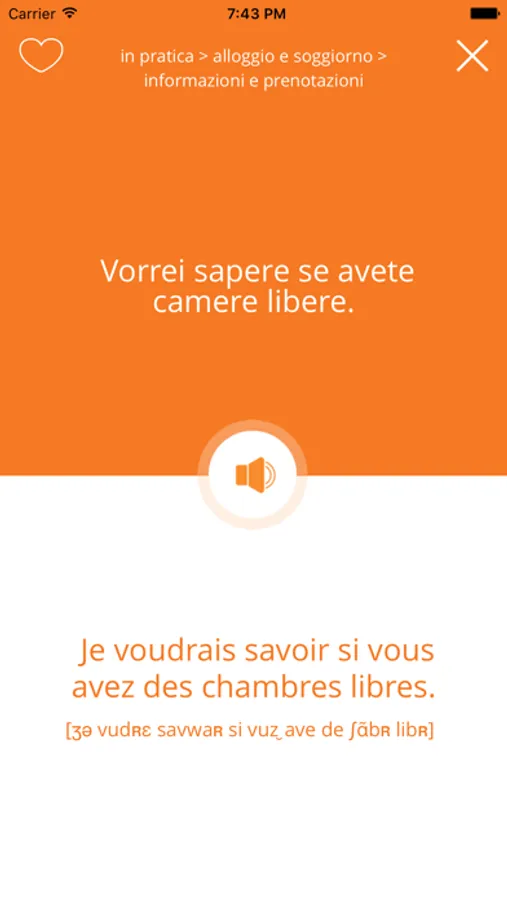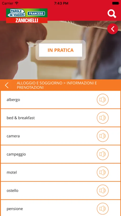 Puoi cercare le parole e le frasi che ti servono a partire dalla lingua italiana o straniera sfruttando il motore di ricerca o partendo da una categoria (informazioni e prenotazioni, in albergo, partenza, arrivo, ...)