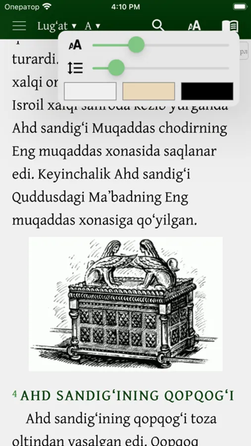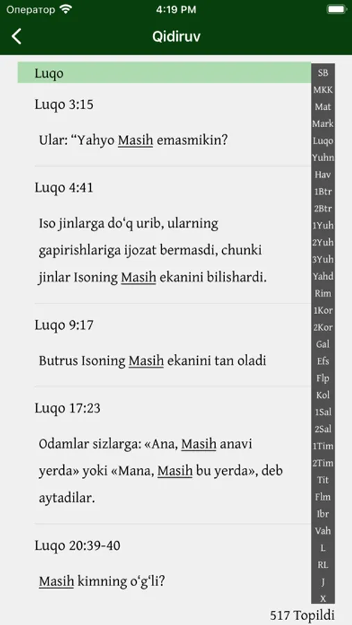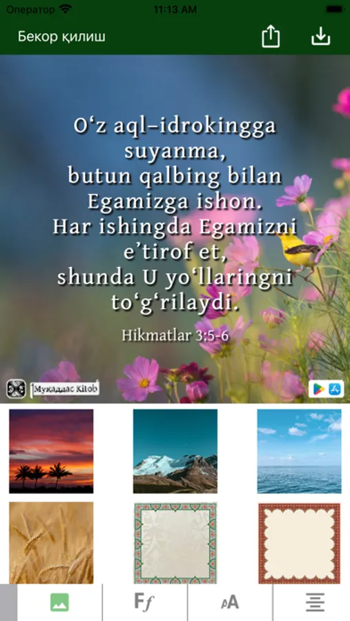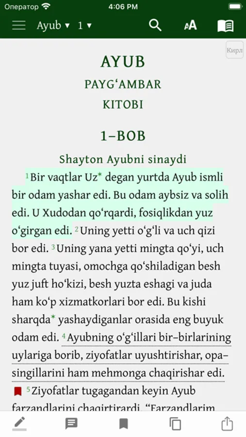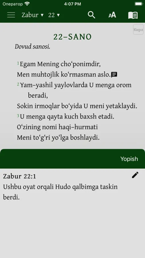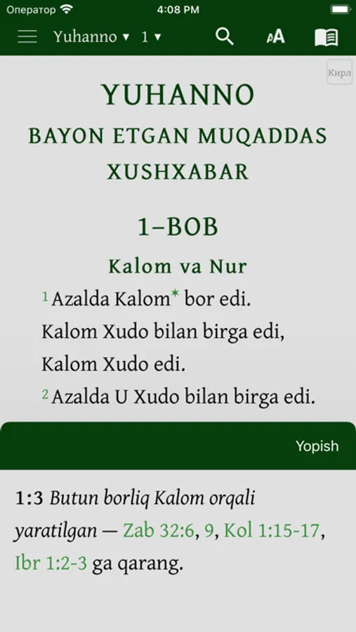 Mazkur ilova o‘zbek tilidagi Muqaddas Kitobning, ya’ni Bibliyaning kirill va lotin yozuvidagi variantlaridan iborat. Kitobxon o‘ziga qulay bo‘lgan yozuvdagi matnni tanlashi mumkin. Shuningdek, u bir vaqtning o‘zida ham kirill, ham lotin yozuvidagi matnni ochib o‘qish imkoniyatiga ega.