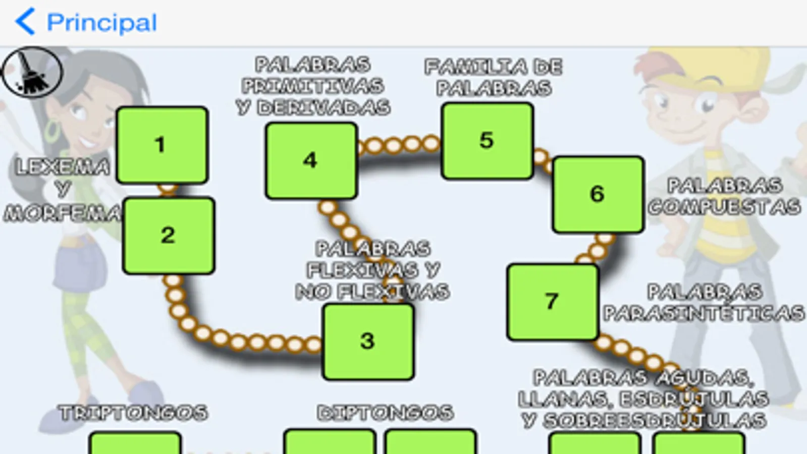 - 38 temas: Lexema y Morfema, Palabras flexivas y no flexivas, Palabras primitivas y derivadas, Familias de palabras, Palabras compuestas, Palabras parasintéticas, Palabras agudas, llanas, esdrújulas y sobreesdrújulas, Diptongos, Triptongos, Hiatos, Acentuación de monosílabos, Acentuación de palabras interrogativas y exclamativas, Género y número de los sustantivos, El sustantivo: clases, Los determinantes, El adjetivo, Grados del adjetivo, Los pronombres, El grupo nominal, El verbo, El adverbio, La preposición, La conjunción, El enunciado: la frase y la oración, El sujeto y el predicado, El predicado, El complemento directo, El complemento indirecto, El complemento circunstancial, Palabras con b y v, Palabras con c, qu y k, Palabras con c y z, Palabras con cc, Palabras con g y j, Palabras con h.