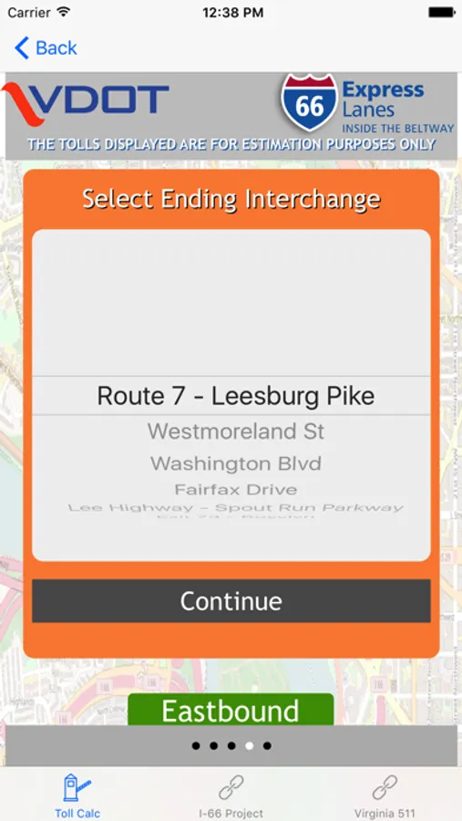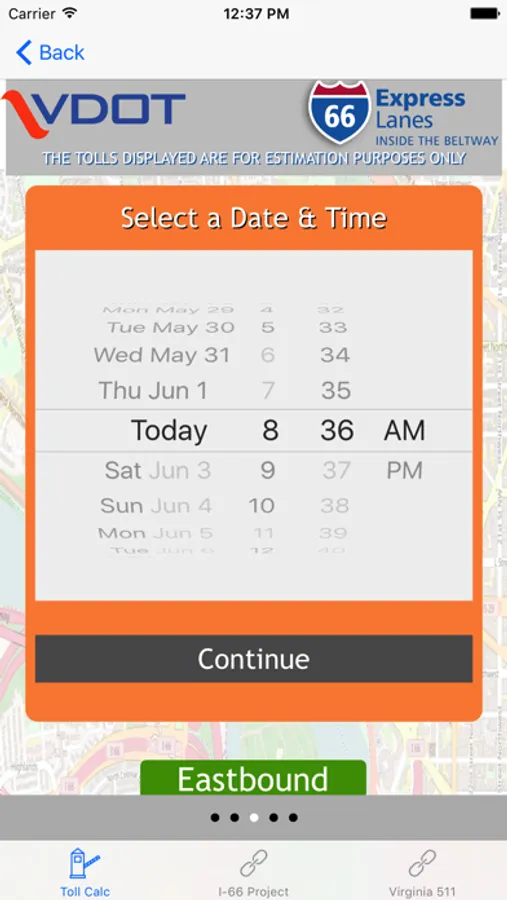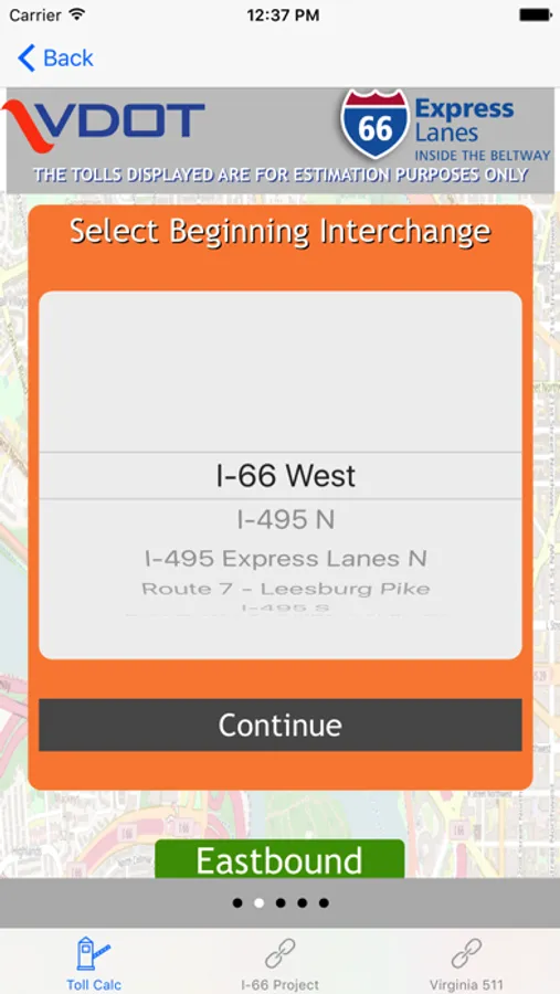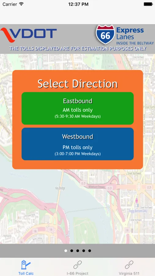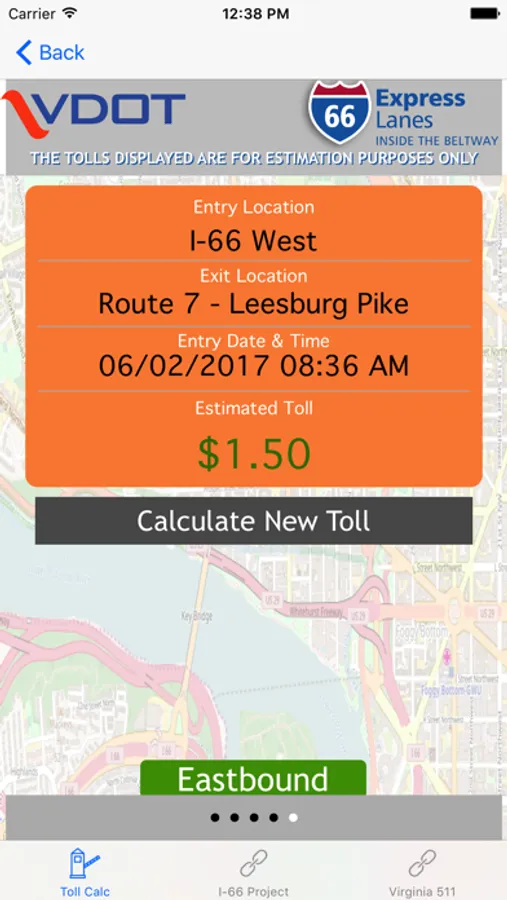Through a simple calculator-style interface, users must select their direction of travel, their entrance point onto the I-66 Express Lanes, date and time of entry, and their exit point off the I-66 Express Lanes. The app will display the estimated toll for the trip. The app provides historical toll prices, up to and including current toll estimates.