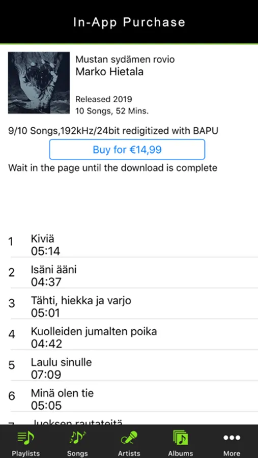 -Marko Hietala's debut album Mustan sydämen rovio in high-quality FLAC 48kHz/24bit, FLAC 96kHz/24bit and FLAC 192kHz/24bit lossless format redigitized with the audio technology developed by Artificial Intelligence Technologies J.K. Oy.
