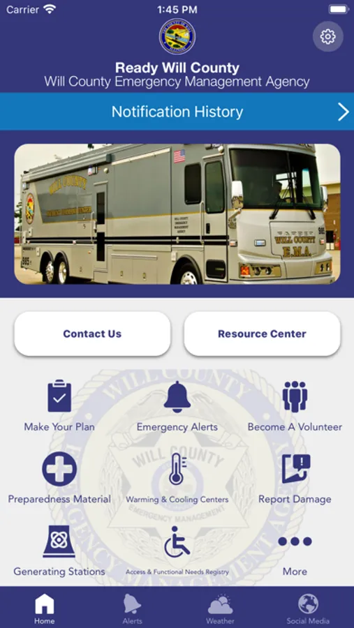 The Will County Emergency Management Agency is excited to announce the 2023 version of the Ready Will County Smartphone Application. This application is offered for free on both apple and android products. The Ready Will County Application is a tool designed to assist the whole-community in preparing for all-hazard incidents and disseminating critical information during emergency situations. This application offers a Resource Center including programs and services available for community members in need and during emergency situations.