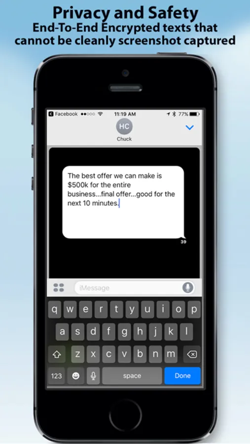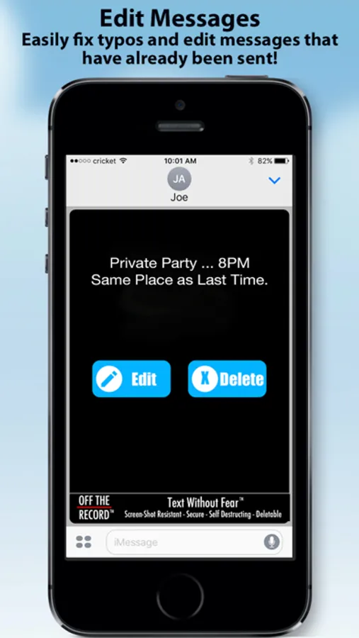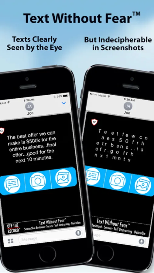 • Use Off The Record™ Texting and Pics to enhance your iMessage capabilities for confidential communications that cannot be cleanly screenshot captured.