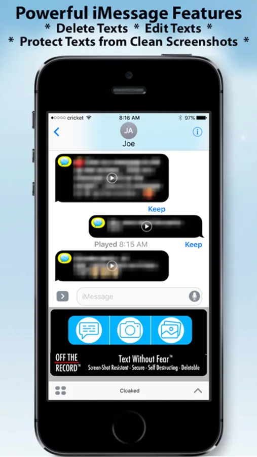Simply put, there is nothing like Off The Record™ Texting & Pics available anywhere. Start sending iMessages without the worry. It's Off The Record™ communication.