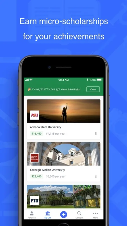 • Add high school achievements, like good grades and extracurricular activities, to your Portfolio and instantly earn scholarships from colleges for each achievement