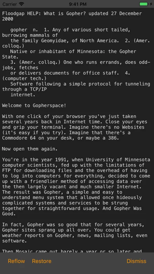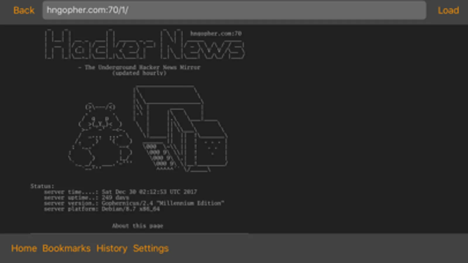 This is is a modern Gopher browser for iOS. Built from the ground up, it lets you access the wealth of data available via Gopher from your favorite devices.