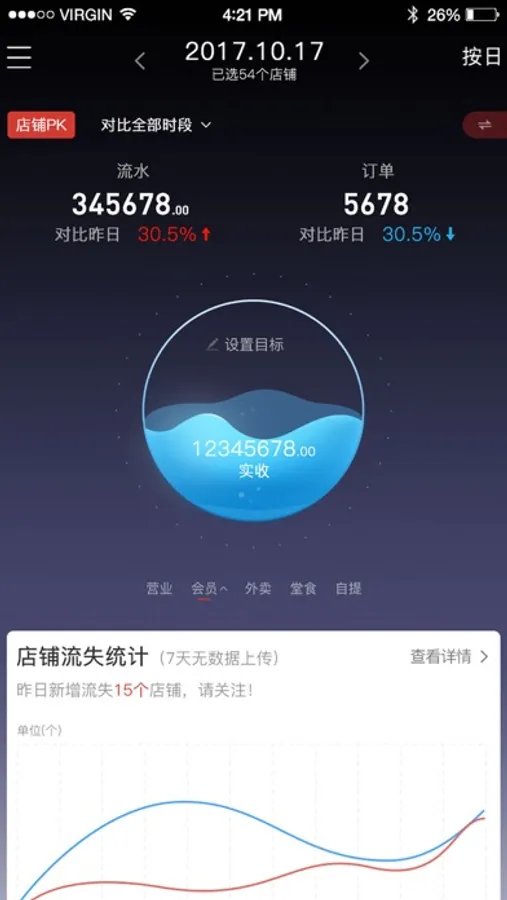 做为一个餐饮老板,我希望:“无论我身处何处都能随时掌握店内的实时营业状况,即便有多个品牌、多个城市、众多门店我也能够一目了然的掌握我最关心的核心营业指标数据,例如:当前客流、订单数、流水、实收、人均、单均、会员消费占比、外卖占比、收款占比等,并能进行日、周、月、季不同周期的切换,查看各核心指标的近期走势”。