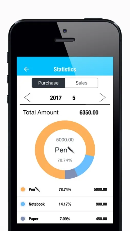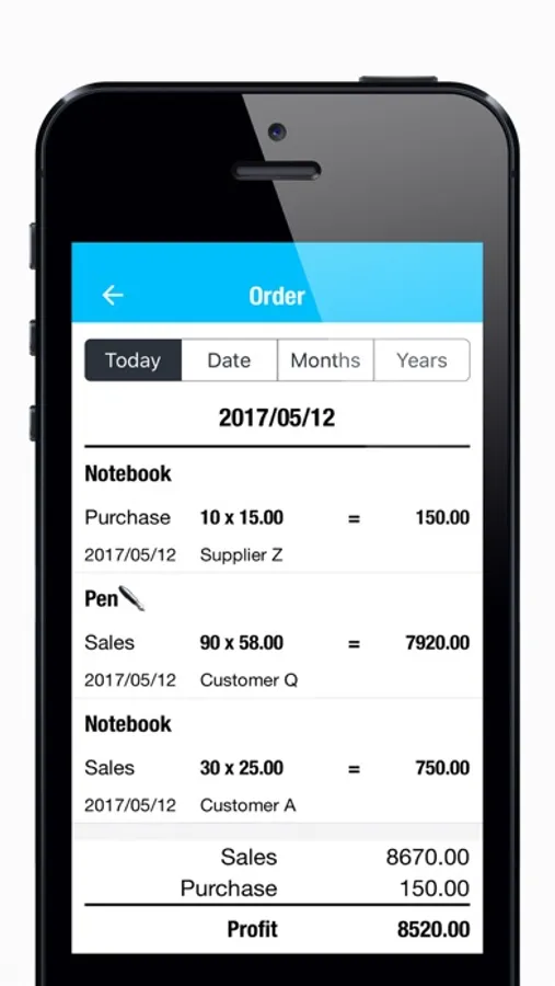 - Select date view (day / date range / month / year) Order details and total profit, total sales, total purchase amount;