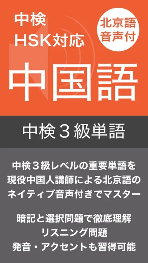 このアプリは中検3級レベルの単語を、北京語によるネイティブ音声を聞きながら暗記・学習するためのiPhoneアプリです。中検3級のみならず、前期・後期試験、HSK などの試験対策にも活用可能です。