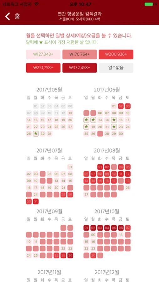 여행가고자 하는 기간 (예: 3박, 4박) 과 지역 (예: 오사카)을 지정하면 금일 기준 최근 1년간 항공요금을 검색하여 최저가를 검색, 최적의 여행 기간을 지정해 줍니다.