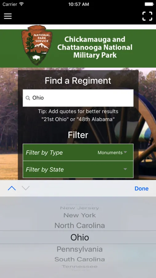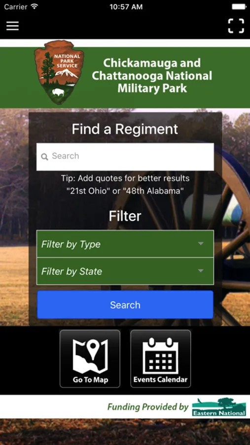 Quickly find and navigate to monuments and markers at the Chickamauga Battlefield. You can search by regiment or state to customize your results.