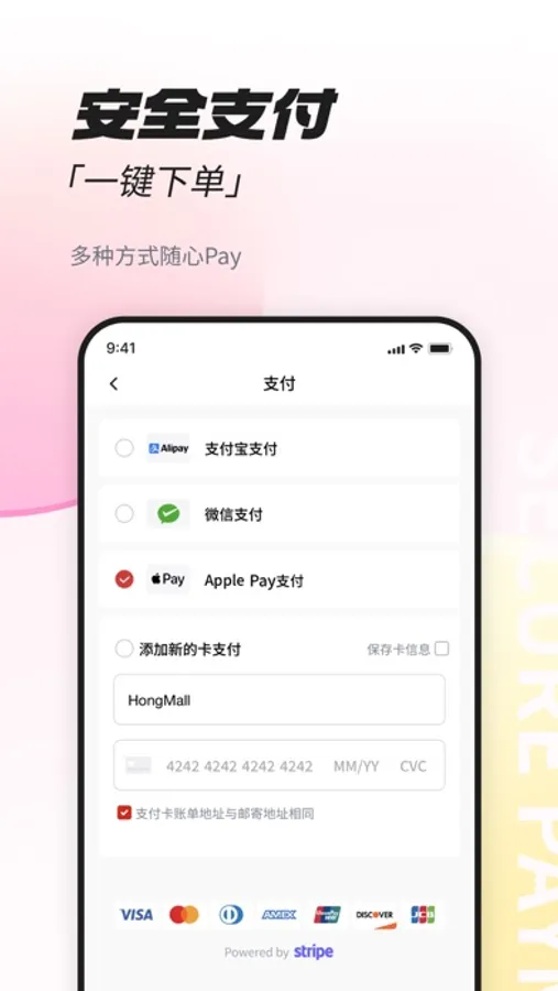 支持Apply Pay、VISA,Mastercard、American Express、China Union、Discover、支付宝、微信支付等多种支付方式,并联合全球知名支付系统Stripe为您全方位保障支付安全。