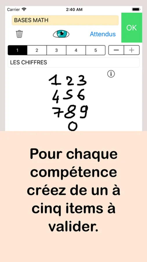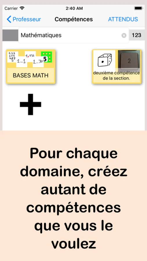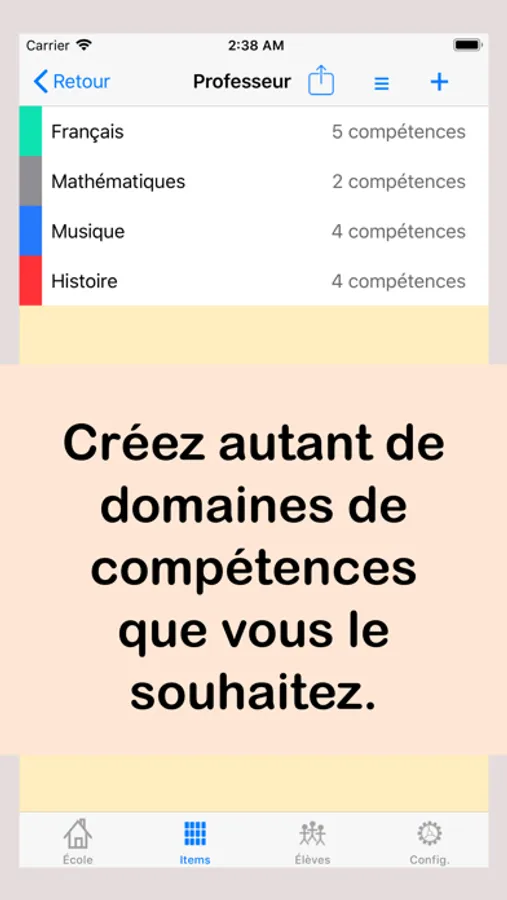 Mais, elle est aussi entièrement modifiable, notamment au niveau du choix des sections, des compétences, des items et prend même en compte jusqu'à 10 exercices/tests par items.L'application pourra s'adapter aux besoins de publics variés ( école, cycle, classe unique, enseignement spécialisé etc...)