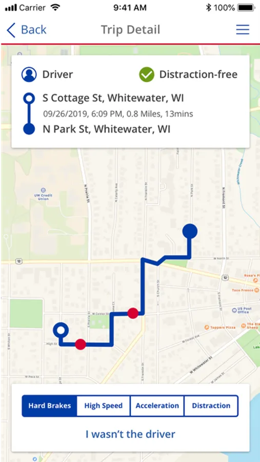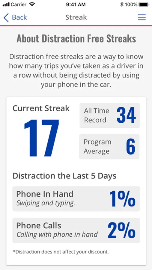 The app displays your discount, trip details, safe driving tips and keeps track of your streak of distraction-free trips. Additional detail is provided on your driving versus others who have the app.