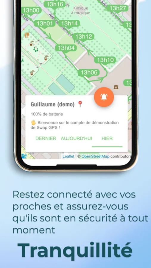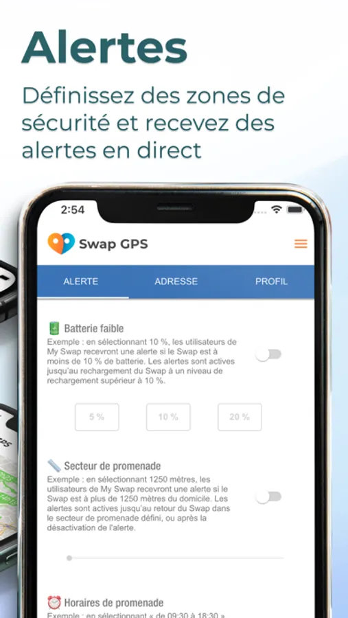L’application permet de suivre en temps réel les déplacements du Swap et d’être prévenu par notifications en cas d’alertes
