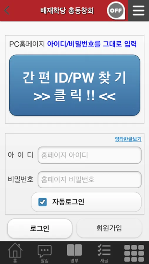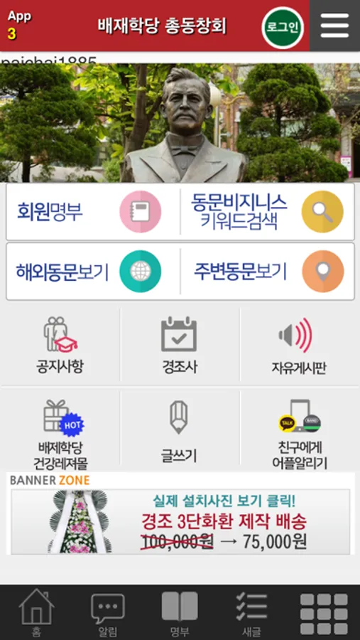 2. 총동문회 산하 각 기수등도 모임별로 별도 어플을 만들어 사용할 수 있습니다.(총동문회 + 각 기수 + 지역모임 + 동호회). 각 모임별 별도 어플생성, 아이디는 전체 하나의 아이디 사용.