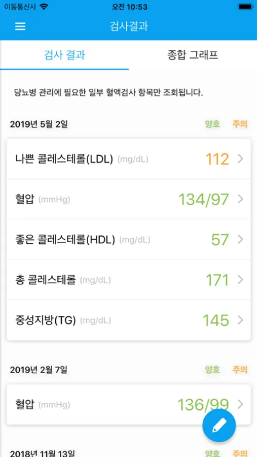 > 검사결과 : 검사일별 검사결과 조회, 검사항목별 최대 3년간의 종합 그래프 제공