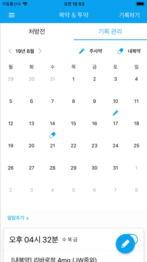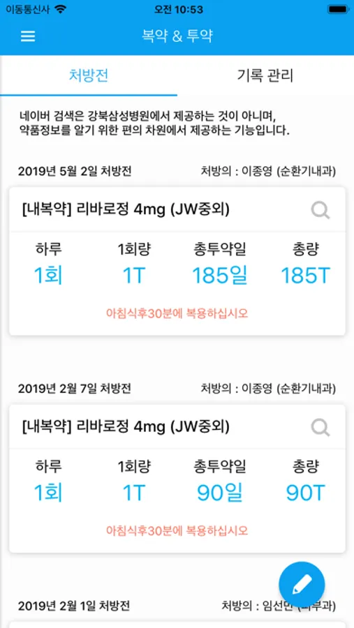 > 처방전 내역 : 처방전 발행일별 발행내역 조회, 처방의약품 네이버 검색 링크 제공