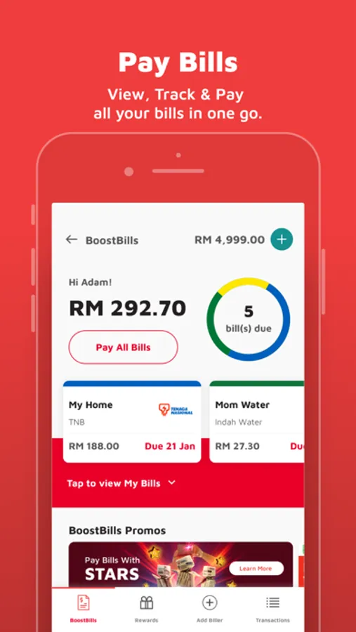 Settle all your bill payments easily - postpaid, internet, electricity, water, TV, all from the Boost app. With our 3 features – AutoBills, MultiBills, and ViewBills – you can now set auto-recurring payments, pay multiple bills in one go, and view consolidated payment information. All you need to do is key in your account details and save them for your next payment. You can earn Stars for every Ringgit spent and use them to enjoy instant discounts on your bills.